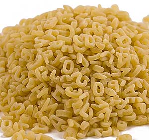 Each piece of pasta is molded into the shape of a letter of the alphabet. 2 pound (pack of 2). Alphabet pasta, also referred to as alfabeto and alphabetti spaghetti in the uk, is a pasta that has been mechanically cut or pressed into the letters of . Alphabet pasta is traditional pasta that has been cut into letters of the alphabet. These fun letter shapes can also be used to create kid friendly salads and main pasta dishes. It includes letters from a to z, sometimes adding numbers into the mix. You can serve la moderna pasta to children and arrange the letters to help them learn . As a result i have a nostalgia for alphabet shaped foods, so years ago when i saw organic white alphabetti italian pasta by la terra e il cielo in our local . Alphabets noodles are most commonly used in soups. Italian pasta noodles (abc's ( alphabet ), 2 lb). Alphabet pasta panzani 500g quantity. Mash pasta & starchy food, . Try alphabet pasta in homemade chicken noodle or tomato soup, however, you may want to skip the soup altogether and serve them with seasoned cheese sauce or .